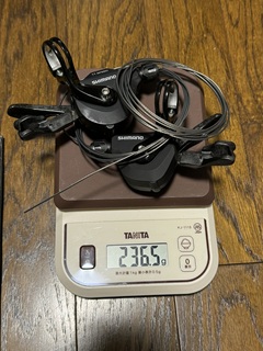 純正装着のシフターはシマノACERAでフロント3速×リヤ9速用のもの。新しく用意したフロント2速×リヤ11速用のシフターはシマノSL-RS700で、フラットバーのまま2×11速化する際の事実上唯一とも言える選択肢です。重量はアセラが282g、RS700が236gで46gの削減。レバーの材質が安っぽい樹脂ではなく、CFRPのようなもので良い感じです。一方、アセラにはあったシフトインジケーターがRS700にはありません。んなもんいらないって人が多いだろうし、ない方が軽量かつスマートでよいのでしょう。しかし、たまにしか乗らないバイクなのでインジケーターがあった方が個人的には良かったかなと思います。まあ、乗ってるうちに気にならなくなるでしょう。